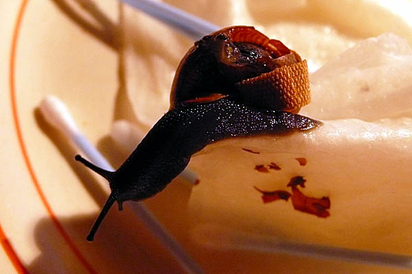 War Donnerstag abend auf einem asphaltierten Wirtschaftsweg in der Eifel spazieren. Kurz vorm Auto, es wurde langsam dunkel, sah ich ein hübsches Schneckenhäuschen auf dem Boden liegen, Mündung oben, offensichtlich leer - oh, ein Baumschneckenhäuschen, dachte ich, das nehme ich mit, und hebe es auf... da schaut mich von der anderen Seite ein vorwitziges Schneckenköpfchen an.