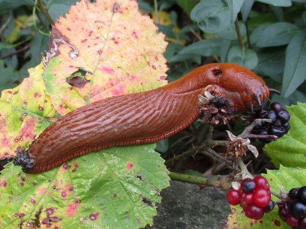 heute sah ich diese große Nacktschecke, wie sie genüsslich an einer Brombeere fraß.