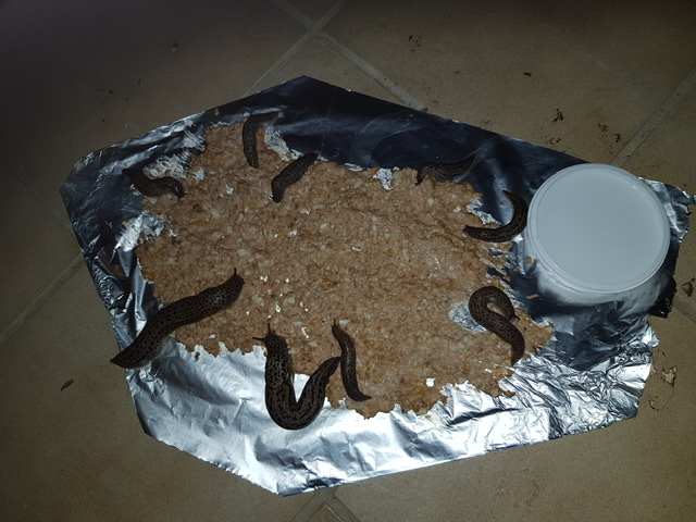 Was dann passierte, war wirklich putzig. Nach und nach trudelte die ganze Familie ein. Aber nur eine kleine machte sich sofort über den Brei her. Alle anderen liefen buchstäblich um den Brei rum und wollten schon wieder abdampfen. Komisch, vielleicht ist das nicht so geruchsintensiv, um als Nahrung erkannt zu werden. Oder einfach unbekannt.