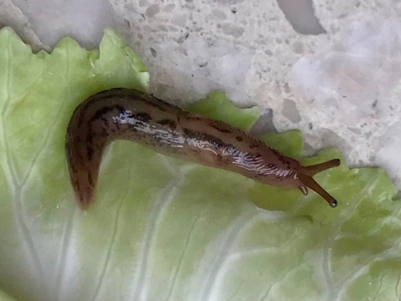 ich habe eine kleine Fundschnecke, sie kam mit der Essensbestellung (mit viel nicht angemachtem Salat). Es ist eine kleine getigerte Nacktschnecke. Nach meinen Recherchen müsste es entweder ein Jungtier eines Tigerschnegels oder eine genetzte Ackerschnecke sein. Das Atemloch (auf dem Bild zu sein) ist eher hinten, aber nicht schwarz umrandet (irgendwo habe ich gelesen, es sei bei Tigerschnegeln schwarz umrandet). Und ich kann keinerlei Ansatz eines Kamms erkennen (dort stand auch, dass Tigerschnegel einen leichten Kamm hinten am Rücken hätten). Aber sicher bin ich nicht. Sie ist im gestreckten Zustand schätzungsweise 2,5 cm lang.
