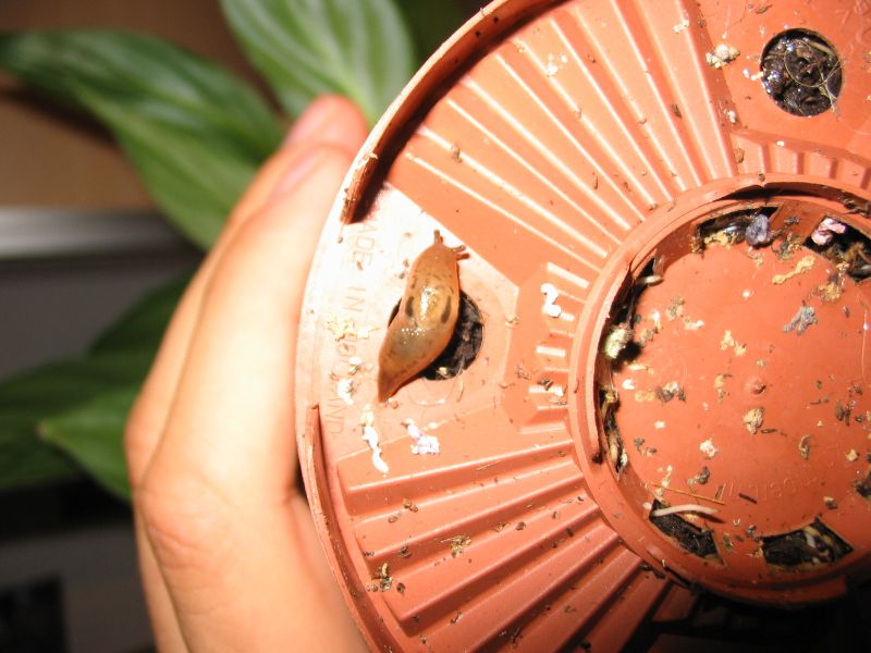 Ich habe vor über einen Monat eine Pflanze, genauer gesagtSpathiphyllum , geschenkt bekommen, und habe vor etwa einer Woche zur Überraschung festgestellt, dass sich Nacktschnecken in der Erde befanden, und manchmal unter dem Topf kleben. Ich habe versucht sie zu bestimmen, und meine dass es Schnegel sind, da sich das Atemloch relativ weit hinten befindet. Die größte habe ich fotographiert, die kleinen zeigen das gleiche Muster auf dem Mantelschild. Nachdem ich die Große in ein Terrarium gegeben habe ist sie leider bald gestorben. Ich habe keinerlei Erfahrung zur Schneckenhaltung, mit was könnte ich sie füttern. Mir war es gelungen die große mit Apfelstücken zu füttern. Oder war das ein Fehler?