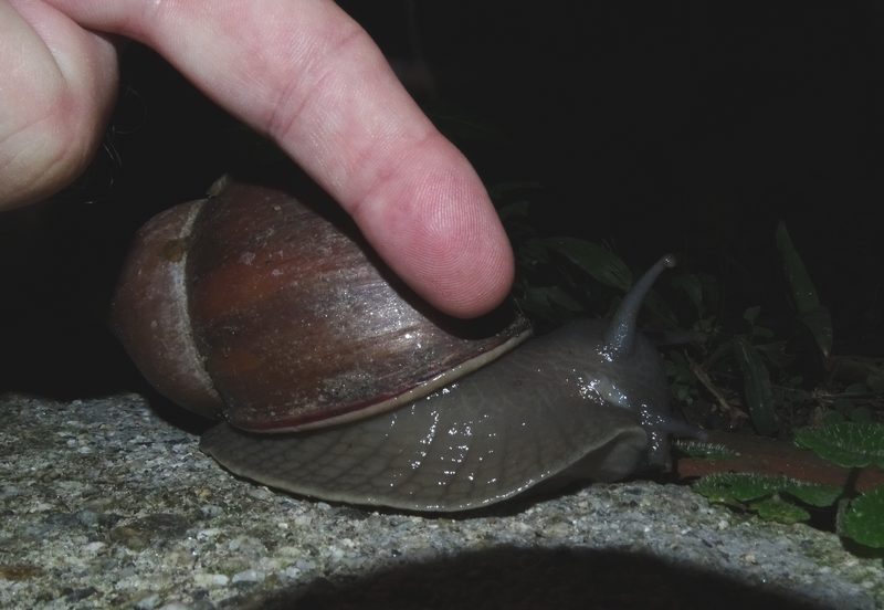 Im November waren wir in Venezuela in der Küstenkordillere unterwegs. Es war das Ende der Regenzeit, und vor allem bei feuchtem Wetter haben wir nachts dort mehrmals diese riesigen Schnecken gefunden.