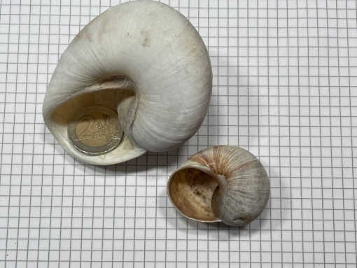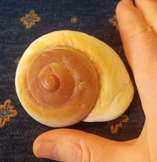 Google hat mich leider nicht weiter gebracht. Kann mir jemand sagen, was ich da heute am Wegesrand gefunden habe? Etwa 8cm Durchmesser. Dagegen sieht eine normale Weinbergschnecke winzig aus.