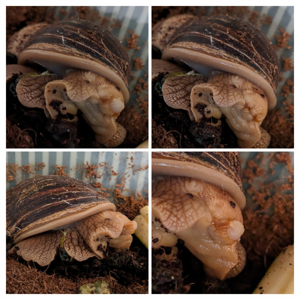 ich habe mich heute hier angemeldet, da ich gerne um Rat fragen würde was eine meiner 5 Achatschnecken angeht (Privatzucht, vermutlich Achatina immaculata Mix, geschlüpft im April 2021). Sie ist Anfang Januar aus der Trockenruhe erwacht und hatte gelegentlich einen Kussmund bzw. die Radula bzw. eine kleine "Blase" vor dem Mund, daher habe ich vermutet, dass sich ein Eingeweidevorfall ankündigt. Seit 3 Tagen sitzt sie nun an der wärmsten, trockensten Stelle im Terrarium (sie hatte sich selbst dort hin begeben), hatte auch zunächst noch alles gegessen, was ich ihr hingelegt habe. Seit gestern nun frisst sie aber nichts mehr und hat alle 4 Fühlerchen nahezu dauerhaft eingezogen. Ich vermute sie hat Schmerzen und jegliche Reize wie Licht etc sind ihr zu viel. Manchmal zieht sie den Kopf etwas ein, die "Blase" vorm Mund kann sie auch noch einziehen. Dazu kommt aber, dass es nun auch so aussieht als ob sie einen Mantelkollaps erlitten hat (der Häuschenrand erscheint ausgefranst und der Mantel ragt über das Haus hinaus), aber da sie sich nicht bewegt, kann ich es nicht genau sagen.