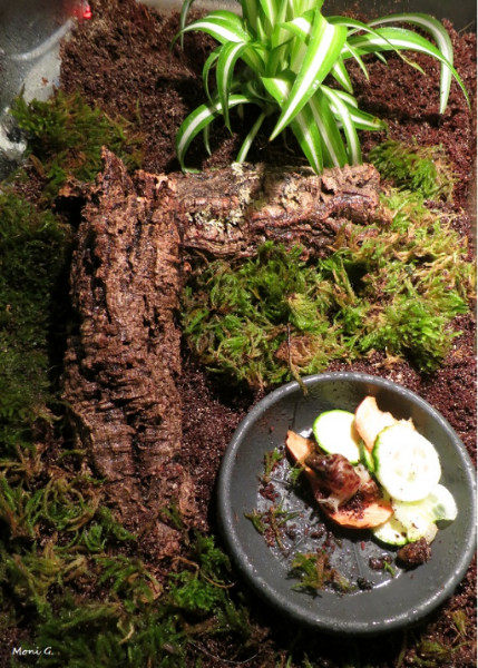 Inzwischen haben sich die drei sehr gut eingelebt. Sie verstecken sich tagsüber in den Korkröhren und abends kommen sie pünktlich zum Essen. Sie sind jetzt 8 Tage hier und ich bin wirklich sehr zufrieden mit der Entwicklung. Besonders von Minipli