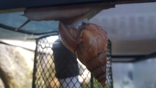 Meine Lissachatina Fulica caramel ist in den letzten Tagen öfter von der Rückwand und Decke gefallen. Gestern war sie auch im Gehäuse verdreht. Der Schwanz schaute in die Richtung, wo eigentlich der Kopf hingehört und der restliche Körper war im Gehäuse.