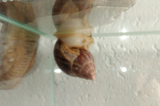 Ich hatte mir im letzten Jahr eine White Jade gekauft. Zu dem Zeitpunkt wusste ich noch nicht, dass es kleinwüchsige Achatschnecken gibt und hatte so etwas nicht im Hinterkopf. Als ich sie holte, war Sie ½ Jahr alt und ca. 5 cm groß. Ich dachte: Ey, deine anderen beiden sind 12 und 15 cm groß. Das bekommst du schon hin mit der Kleinen.“ Aber so war es nicht. Sie wuchs schlecht und baute kruschelig an. Dann erfuhr ich von kleinwüchsigen Schnecken. Sie bekam Getreidebrei und es wurde besser, aber wuchs weiterhin schlecht (auf dem Bild zu sehen).
