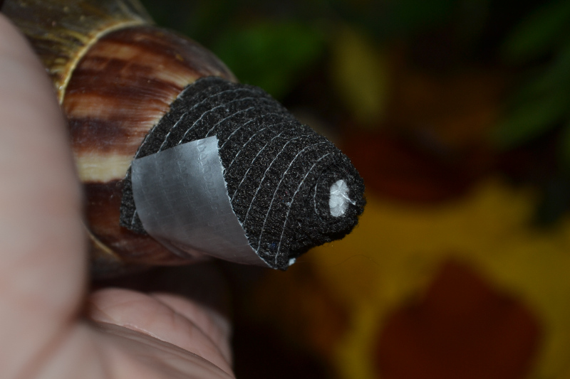 Sie ist an ihren Lieblingsplatz, unter der Terrariumdecke geschneckt. Dann hat sie ihren Apex immer wieder über den Ast, der da oben befestigt ist, "geschabt". Bis das Tape ab war bzw. daneben hing. Dann hat sie sich zum Schlafen eingezogen.