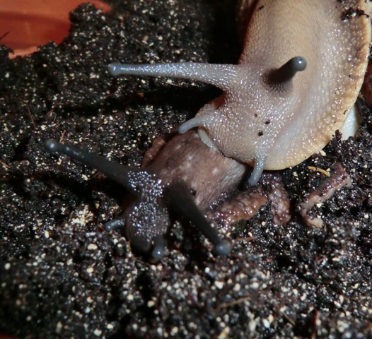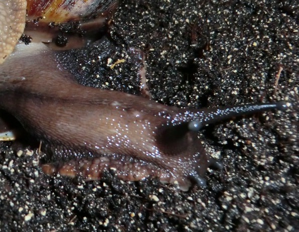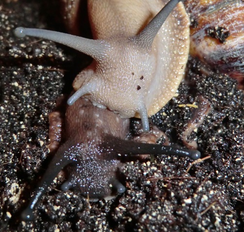 Sie wollte nicht rauskommen, hab sie dann einfach mit ins Terra gesetz. Meine Dicke (3x so schwer wie die Adulte) war total neugierig und saß dann auf ihr drauf. Ich fand das soo süß und habe dann Bilder gemacht, dann sah ich das die Adulte Schnecke lauter kleine Beulen auf dem Weichkörper hat, heller als der rest der Haut. Was könnte das sein?? ist das schlimm??