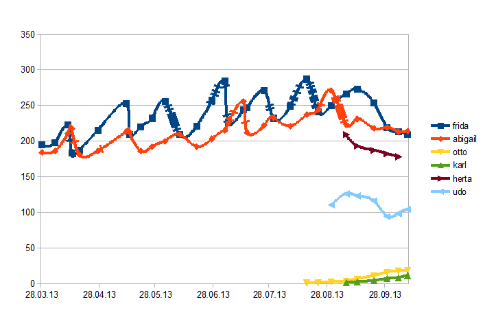 Insgesamt sind die Gewichtszunahmen natürlich auch nicht Weltbewegend. Frida fehlt zu Ihrem maximalgewicht von mitte august rund 75g! Das ist 1/4 Schnecke - vor allem wenn man bedenkt, dass das meiste des Gewichts auf das Haus geht, so hat sich die Schnecke innerhalb kürzester zeit fast halbiert.