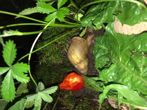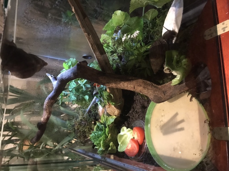 Die Schnecken sind ca 2 Jahre alt, bei mir geschlüpft und bisher geht es ihnen egtl -von außen betrachtet-gut. Sie fressen normal, alles Mögliche, was an Gemüse, Salat, Kräutern v draussen so anfällt.