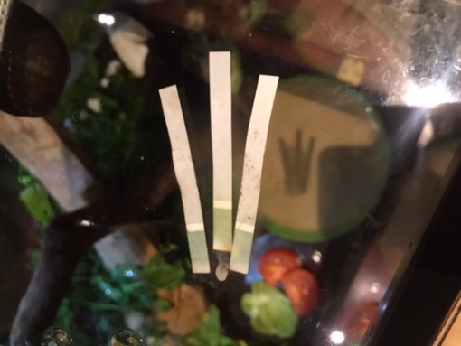 Im Terra leben allerhand Asseln, Regenwürmer und 1000-füssler, die über die letzten beiden Jahre mit Moos und Laub aus dem Garten eingewandert sind u sich hier gut machen als Putzkolonne. Der pH-wert ist bei 7-8 (s Foto Teststreifen).