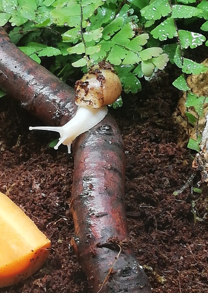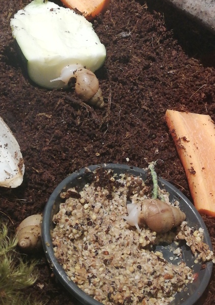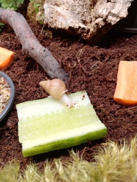 Ich füttere zur Zeit Salat, Süßkartoffel, Möhre, Zucchini, Gurke und Erdbeeren, wobei immer mindestens 3 verschiedene im Terra sind, damit sie sich aussuchen können was sie wollen. 1x in der Woche gibt es einen Getreidebrei.