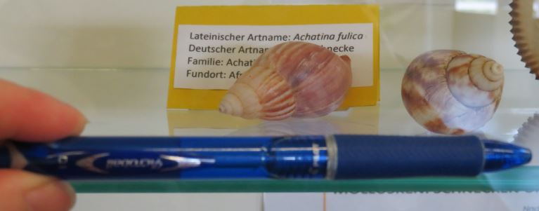 Die andere zwei wurden als Achatina fulica bezeichnet. Allerdings... ich finde nicht, dass sie farblich nach A. fulica aussehen, von der Farbe her. Die Vitrine steht zwar hell, aber die Sonne dürfte nie direkt darauf fallen. Ich habe mal Bilder angehängt. Bei A. fulica fand ich nämlich auch die Größe nicht beeindruckend. Um es vorsichtig auszudrücken. Die Häuser der A. fulica waren recht weit vorne, so dass ich das gut mit dem Kugelschreiber vergleichen kann.