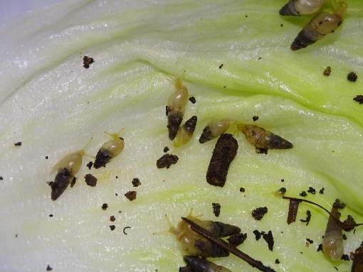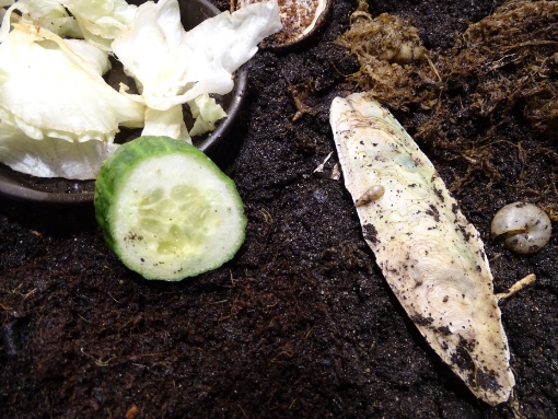 Im selben Garten unter losen Steinen (kleine Mulden zwischen Stein und sandigen Boden, der aber sehr hart ist) konnte ich diese kleine Schnecken von 2 - 2,5 cm Größe finden. Leider keine Ahnung um was es sich für eine Art handelt. Diese Art vermehrt sich schon recht gut und die größten Jungschnecken sind schon fast 1 cm groß. Auf der Gurke sind sie noch sehr klein, die Eier etwas kleiner als 1 mm.