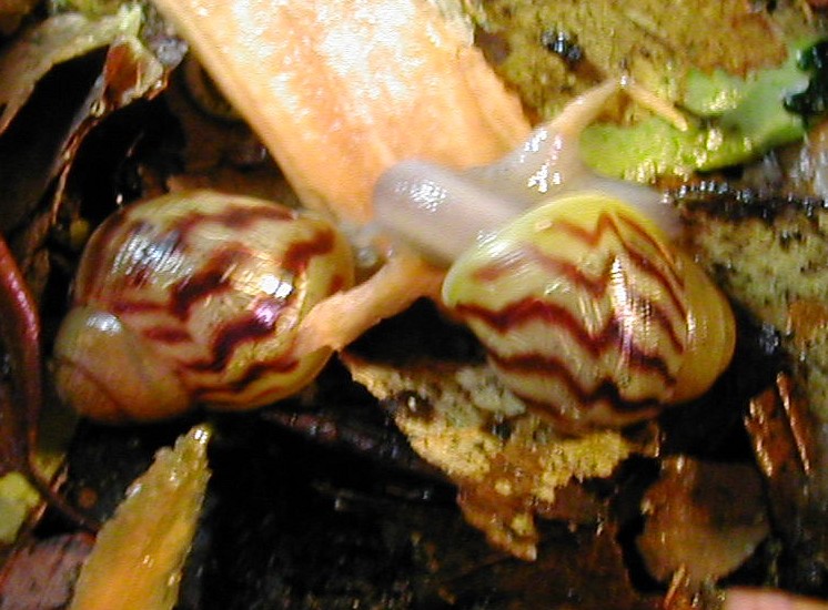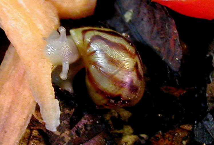 Bis jetzt habe ich 5 Jungtiere gesehen (ich habe mich sehr zusammen genommen und nicht alle Blätter umgedreht). Alle sind schon relativ groß. Drei schätze ich auf 12 bis 15 mm. Das Gehäuse ist undurchsichtig und zeigt das typische Streifenmuster von jungen Achatinas. Ein Jungtier ist etwas kleiner und hat ein deutlich helleres, aber undurchsichtiges Gehäuse. Das letzte Jungtier ist ca. halb so groß wie die ersten drei und hat eine schwach-pigmentierte, durchscheinende Schale.
