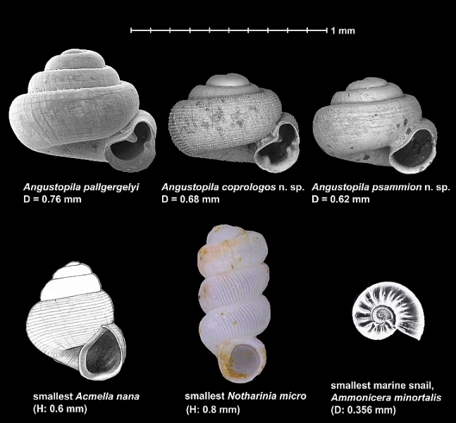 Angustopila pallgergelyi, Acmella nana, Notharinia micro, the smallest marine snail, Ammonicera minortalis, and the two new species [Angustopila coprologos n. sp. and Angustopila psammion n. sp.] described herein.