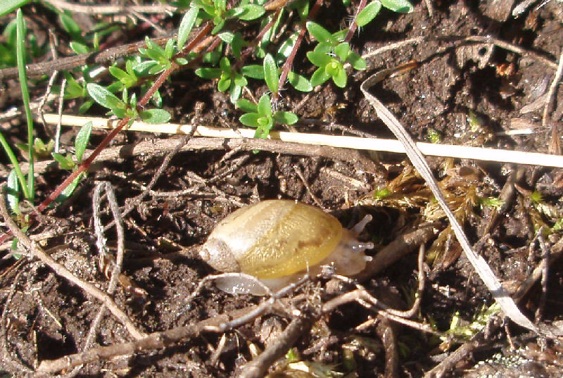 Hier eine Bernsteinschnecke (Welche Art?) in einem Naturreservat im südlichen Falbygden, bei Dala, zwischen Skövde und Falköping. Auf einer steppenartigen Trockenwiese, Kalkstein. Da war kein Wasser in direkter Nähe.