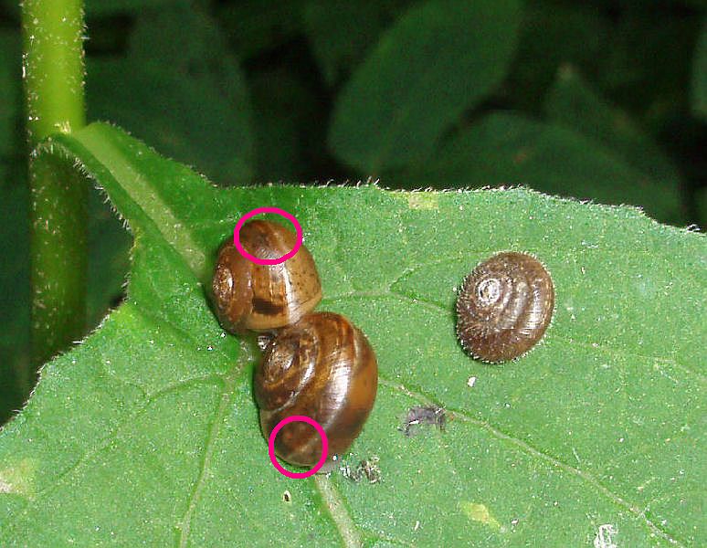 Die Jungtiere neben dem haarigen Trochulus halte ich für junge Arianta arbustorum (wegen der Größe und Form und dem erkennbaren braunen Peripheriestreifen, siehe Bild).