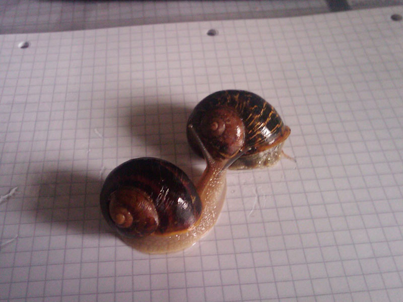 Diese beiden Schnecken habe ich vor etwa 4 Wochen von meinem Vater bekommen. Er hat sie in seinem Garten gefunden. Die Schnecke im Vorderungrund war da noch um einiges kleiner und ist seit dem sehr gewachsen. Die Schnecke im Hintergrund war schon ausgewachsen. (nach außen gewölbte Lippe) Sie ist ganz bestimmt eine Gefleckte Weinbergschnecke. Doch ist die im Vordergrund auch eine? Ihr Körper ist recht hell, ihr Haus hat nicht diese hellen Flecken. Sie hat einen deutlich erkennbaren Nabel im Gegensatz zu der Schnecke im Hintergrund.