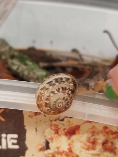 Ich habe heute eine kleine Schnecke kurz vor meinem Haus in der Nähe des Rheinufers an einer Steinwand gefunden. Sie ist ca. 7-8mm groß, hat ein dunkelbraunes Haus und einen weißen Strich. Allgemein sieht sie fast aus wie eine junge Weinbergschnecke, was mich allerdings irritiert ist, dass ihr Haus so flach ist und genau dort, wo der weiße Strich ist, eine markante Kante besitzt. Ich selbst habe schon mehrere Weinbergschnecken (Cornu aspersum) aufgezogen, bei denen ist mir das noch nie aufgefallen.
