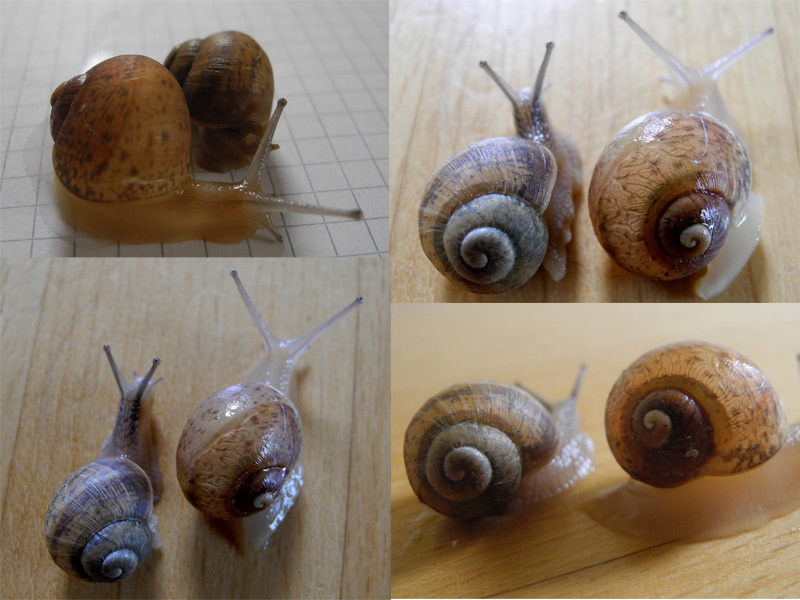 Ich habe neulich in meinem Garten zwei Jungschnecken entdeckt, die ich wirklich nicht zuordnen kann. Meiner Meinung nach sehen sie aus wie Cornu aspersum ohne Flecken, aber die Körperfarbe ist eher die einer Bänderschnecke und die Schale ist ziemlich dünn :eek: Aber seht selbst: