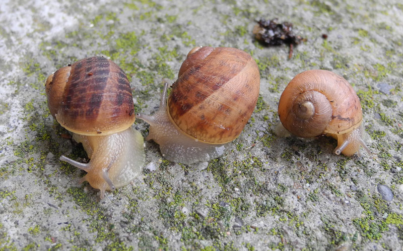 Das Geheimnis ist gelüftet, jedenfalls zur Hälfte. Die grössere der beiden ist ganz klar eine Cornu aspersum, wie sich mittlerweile aufgrund des Musters auf dem neuen Wachstumsrand sagen lässt (die in der Mitte ist's, die anderen sind zwei meiner 'normalen' Jungtiere.):