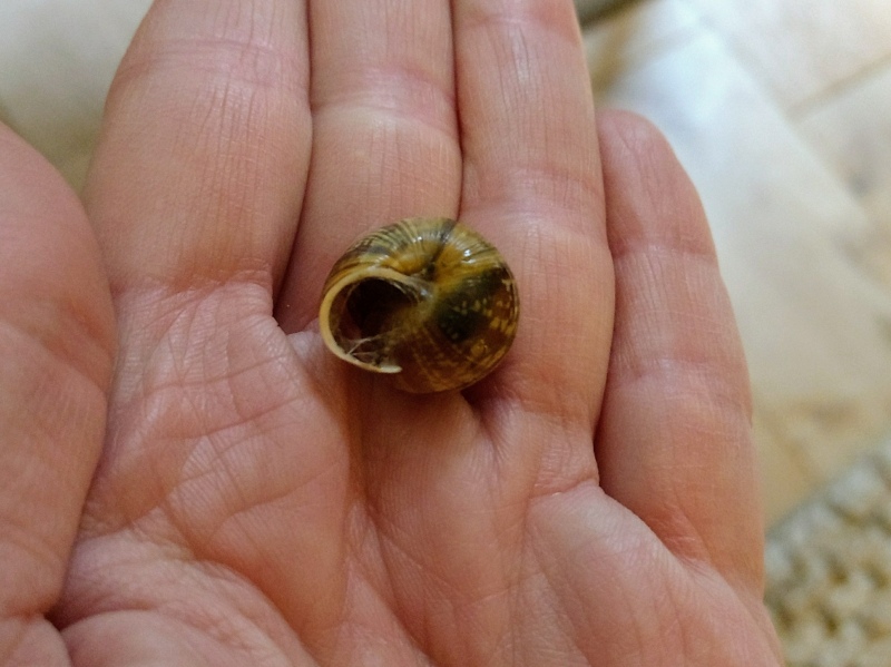 Von der Häuschenform sieht es für mich wie eine Bänderschnecke aus, allerdings ist die Zeichnung ungewöhnlich. Außerdem ist der Weichkörper zweifarbig. Der Fuß ist an der Sohle braun und oben drauf fast schwarz. Die Farben gehen nicht ineinander über, sondern sind klar getrennt.
