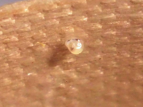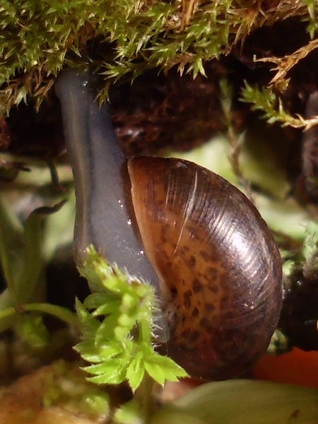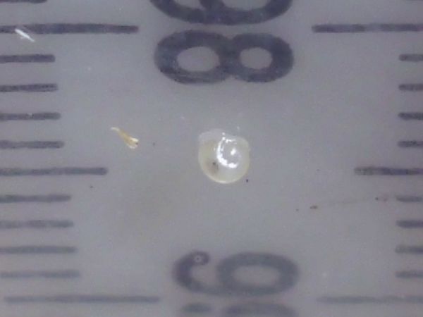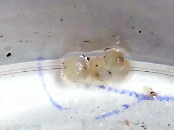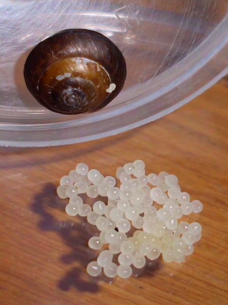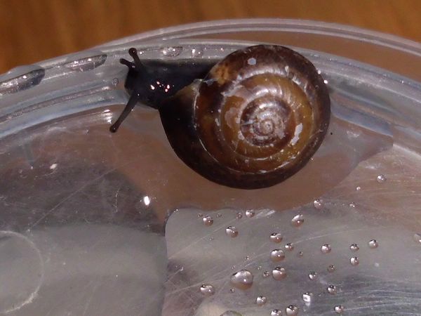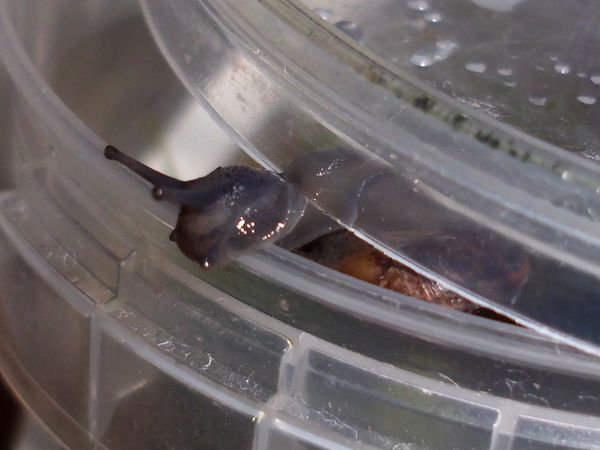 Etwas später schleimte er am Deckel entlang, also dachte ich mir, es wäre Zeit für eine Haferflocke. Aus irgendeinem Grund hat er ein Ei spazieren getragen, so sieht man mal schön das Größenverhältnis.