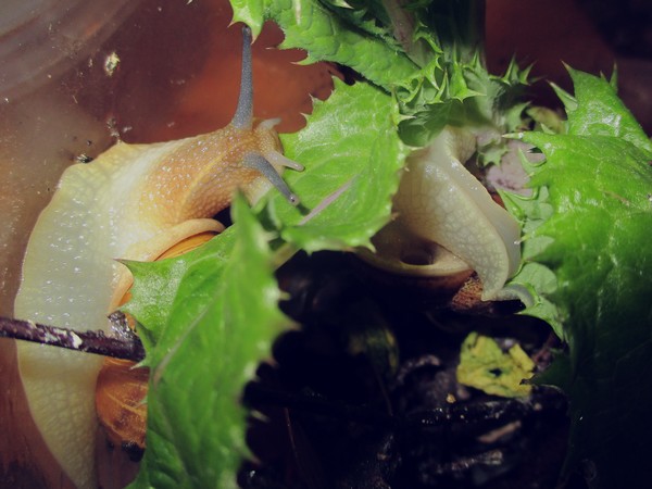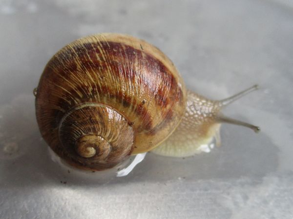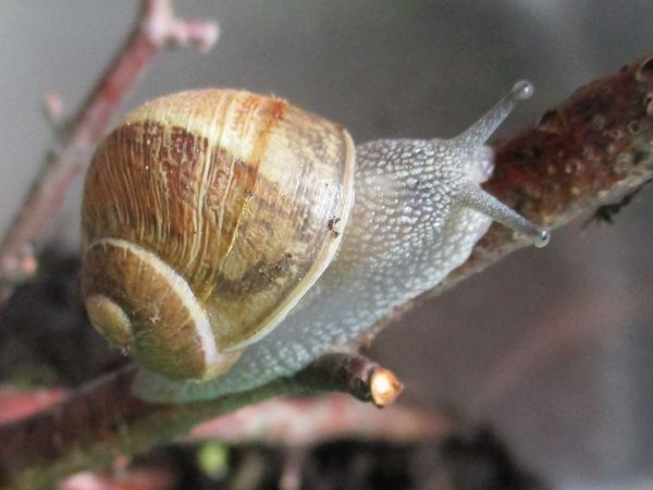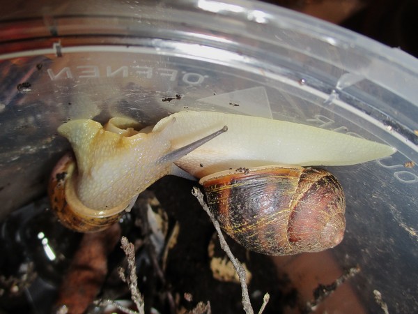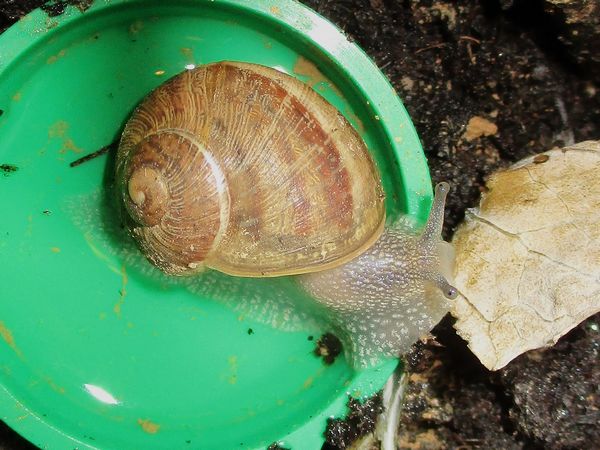 De Kleine ist jetzt meistens wach, schneckt durchs Gelände, futtert von der Gurke, schabt die Zweige ab, kontrolliert die Samen... In ihre Behausung habe ich ein kleines Deckelchen mit etwas Wasser und ein klein wenig Heilerde gesetzt. Ich hatte auch den Eindruck, dass sie da wohl mal dran war, und heute Nachmittag konnte ich dann auch beobachten, wie sie gerade ein Bad nahm.