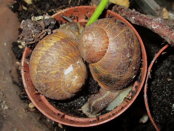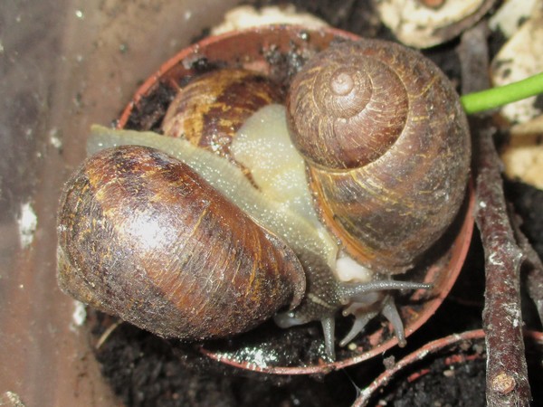 Offenbar hatten sie die Köpfe zusammengesteckt, um zu entscheiden, wer sich denn als nächstes um die Arterhaltung kümmert. Jedenfalls haben zwei von ihnen anschließend eine Menge Schleim produziert, und einen Liebespfeil sehe ich auch an der Wand kleben...