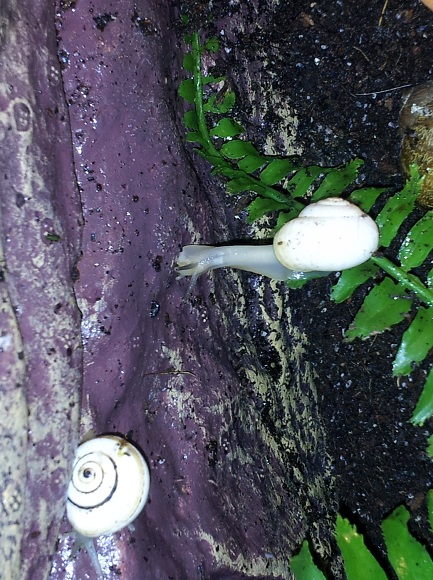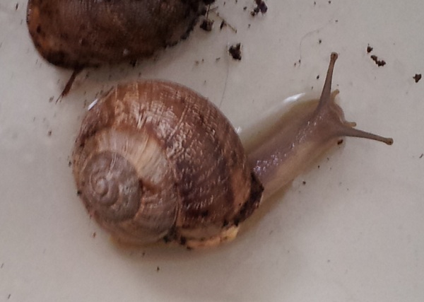 Das ist die Rückseite der beiden Tiere von oben. Wenn ich die Weichkörper vergleiche, dann finde ich die vermutete Eobania heller und glatter, die vermutete Cornu ist eher "noppig" und dreckig-beige.