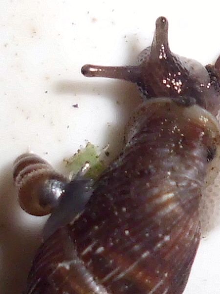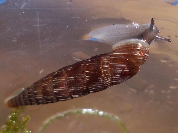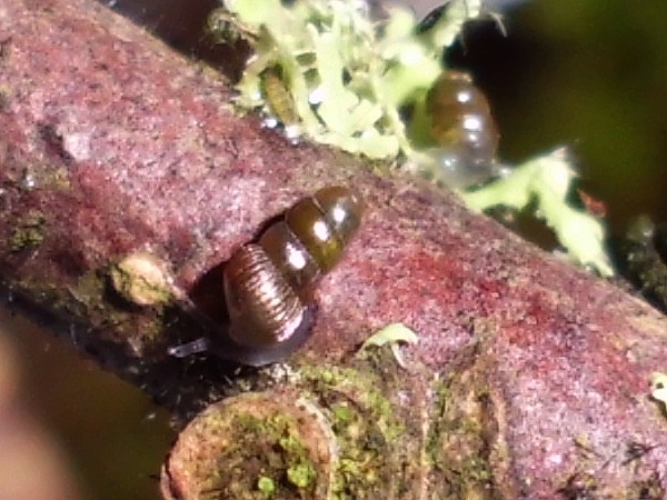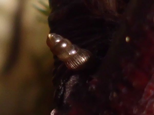 die vier Schließmundschnecken sind zusammen untergebracht (mit den beiden jungen Bänderschnecken, scheint gut zu funktionieren). Vor fünf Tagen entdeckte ich bei ihnen eine winzige Schnecke, die ich zunächst nicht einordnen konnte. Da ich grad ein paar flechtenbewachsene Zweige habe, von denen ich gelegentlich ein Stück in passender Größe abbreche, anfeuchte und dann zu den Schnecken gebe (die Zweiglein sind rucki-zucki blankgeputzt), hatte ich den Verdacht, dass ich damit was eingeschleppt haben könnte. Die vier Windungen verglich ich mit den Windelschnecken, Turmschnecken und ähnlichen, aber so richtig passte nichts, vor allem da die ersten drei Windungen zwar glatt aussahen, der letzte Umgang jedoch deutlich gerippt war.