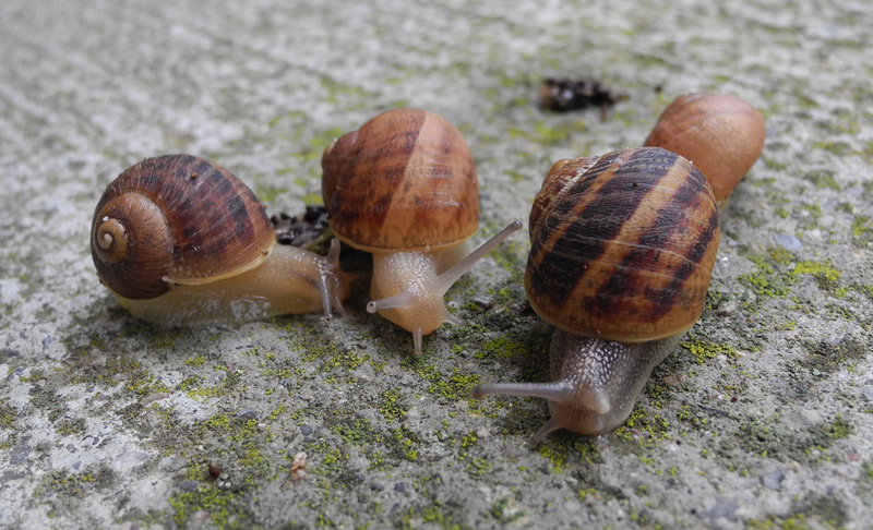 Das Geheimnis ist gelüftet, jedenfalls zur Hälfte. Die grössere der beiden ist ganz klar eine Cornu aspersum, wie sich mittlerweile aufgrund des Musters auf dem neuen Wachstumsrand sagen lässt (die in der Mitte ist's, die anderen sind zwei meiner 'normalen' Jungtiere.):