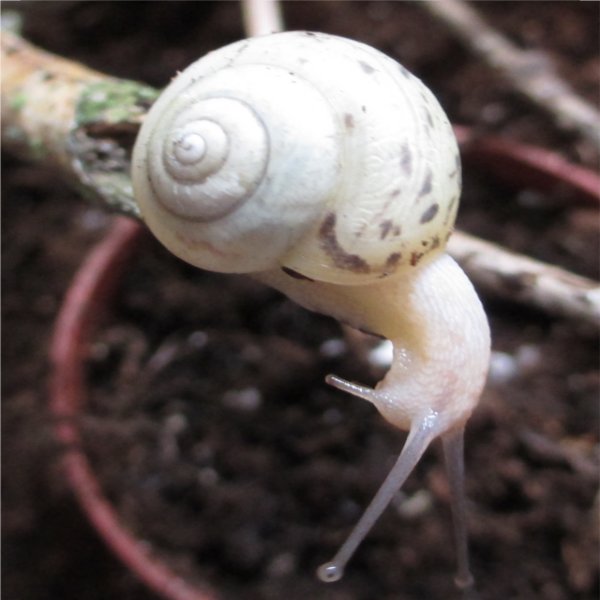 Gestern Abend fanden mein Freund und ich eine weiße Häuschen-Schnecke mit schwarzen Flecken. Der Fundort ist ein Wald in Baden-Württemberg auf den Hügeln des Remstals. Ich habe mittlerweile im Internet nachgeforscht, aber bin mir bei der Art der Schnecke nicht sicher. Ich denke es ist könnte vielleicht eine Häuschen-albinotische Baumschnecke sein. Die Schnecke ist noch nicht ausgewachsen, lässt sehr viel Wasser wenn sie sich erschreckt und ihr Körper hat in der Nähe des Kopfes einen rosanen Farbstich. Wir haben sie mittlerweile auch schon benannt, er/sie heißt Flöckchen
