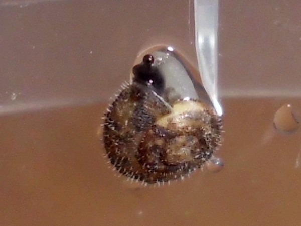 als ich vorige Woche im Segeroth-Park in Essen war, hatte ich ein paar leere Häuschen von Bänderschnecken eingesammelt. Damit sie nicht zerdrückt wurden, kamen sie in eine dieser größeren Tictac-Dosen. Ich hatte gesehen, dass ein wenig Erde rausgefallen war, und wollte sie heute ausspülen (war mit dem Weinberghaus ja ohneschin schon dabei). Dabei stellte ich fest, dass unten in einer Ecke der Dose was festklebte oder eingeklemmt war, aber das fiel schließlich doch raus. Ich hatte es dann in ein separates Döschen getan, natürlich vorsichtshalber mit einem Deckel drauf, und später entdeckte ich dann was oben unter dem Rand sitzen: eine kleine (ca. 3mm) Schnecke.