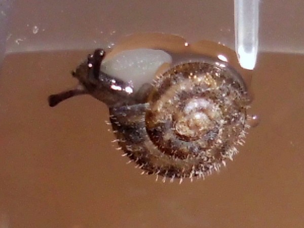 Zum Fotografieren hatte ich die Dose hingelegt, und kurz darauf traute sich das Schneckchen hervor.