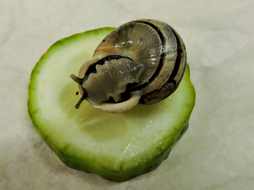 Er hat irgendwann einmal von seiner Istrien-Reise Schnecken mit nach Hause genommen und mir nun sein Glas mit Schnecken überreicht. Diesen Schnecken werde ich natürlich gerne ein gutes Zuhause geben. Dazu müsste ich aber wissen, was das für Schnecken sind und ob sie besondere Bedingungen benötigen. Sie kommen mir etwas dünn vor. Jetzt haben sie erst einmal Zweige mit Flechten, Sepiaschale, Tomate, Salat, Blätter und Gurke zum Knabbern.