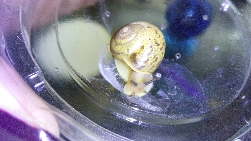 Nr.1: Ihr Haus ist etwa 1,7 cm lang. Und sie hat einfach eine der Schnecken von Nr.2 innerhalb von keiner halben Stunde Gefangenschaft aufgefressen...