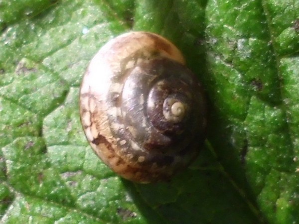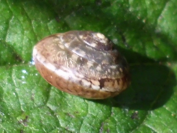 am Sonntag sah ich diese Schnecke auf Beinwell sitzen, Hausdurchmesser etwas unter 1 cm, wenn ich das richtig erinnere. Das Häuschen scheint an der Kante ein wenig beschädigt zu sein.