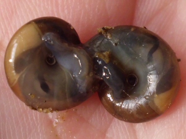 unten an der Mauer mit den Schließmundschnecken (übrigens in Essen, NRW) sah ich was Schneckiges glänzen, ich hatte es dann mit einem Zweig vorsichtig aus der Ecke gerollt.