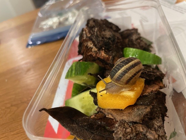 Zu erst haben wir vermutet, dass sie eine Nudelschnecke ist, weswegen sie auch sofort auf Spirelli getauft wurde, mittelweile ist sie ganz schön gewachsen und jetzt überlegen wir, ob es doch eine junge gefleckte Weinbergschnecke ist. :)