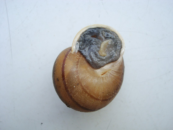 gedrückt, rundlich, dunkelbraun gebändert und fein gesprenkelt, Mündung und Mundsaum kastanienbraun (oder dunkler, das könnte auf dem Bild an der Scheibe zu erkennen sein), ungenabelt;