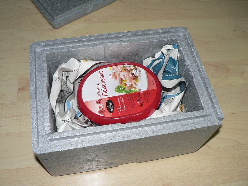 8. Heatpack reinlegen (vorher öffnen und wenn nötig schütteln). Falls das Heatpack zur Wärmeerzeugung Sauerstoff benötigt: ein Loch in die Styroporbox machen, an welchem es liegt. Die meisten Heatpacks benötigen Sauerstoff!