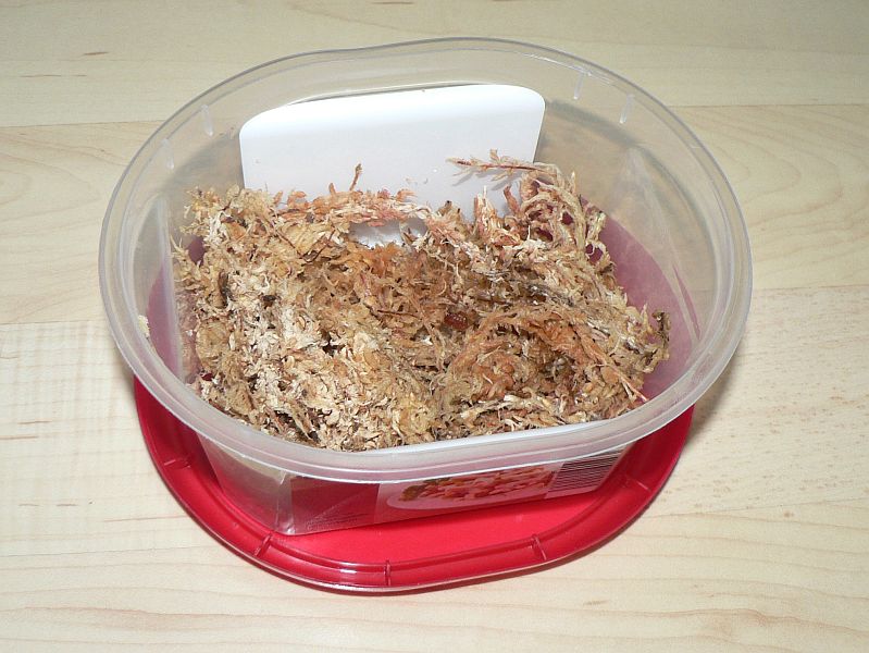 3. Aufgeweichtes Sphagnum-Moos oder Terrarienerde in die Plastikdose geben: