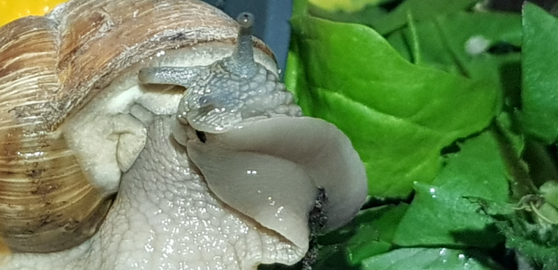 Nun nach der Winterruhe sind fast alle Weinbergschnecken davon betroffen, dass sie nicht mehr richtig raspeln können. Der Mantel ist ebenfalls gelblich verfärbt.