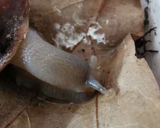Die Schnecke ist heute fast komplett ins Gehäuse eingezogen. Herzschlag ist zu sehen. Ein Stück Schwanzspitze schaut raus. Ich werde sie weiter beobachten. Vielleicht besteht noch Hoffnung für sie.