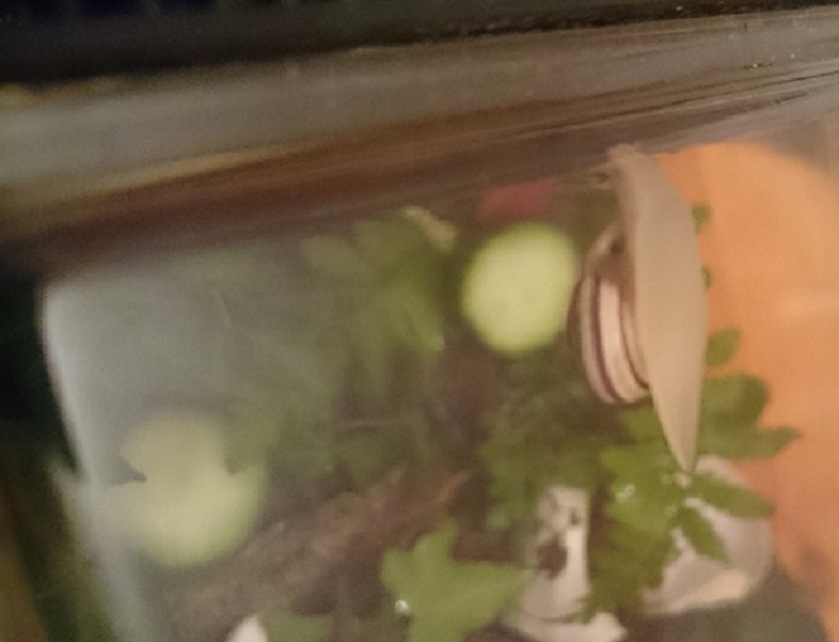 Kann mir denn auch jemand sagen was für eine Art mein Schneck ist? Anfangs dachte ich an einen Bänder wegen den markanten Streifen untenrum, aber oben auf dem Haus sind halt viele Unterbrechungen und Tüpfel