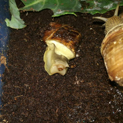 Etwa vor 24 h war noch alles gut, meine beiden Schnecken saßen auffällig oft aufeinander und die nicht betroffene Schnecke hatte einen massiven Hauswachstum (1 cm innerhalb von wenigen Sekunden rausgeschoben o.O) und die jetzt kranke Schnecke hat fröhliche zugeschaut bzw. das neue Stück "betastet".