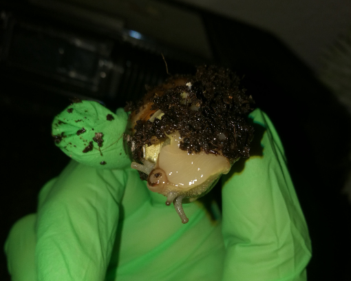 Ich wollte nun wie jeden Abend sehen wie es den beiden geht und sprühen. Und normalerweise wenn ich sprühe, reagieren beide leicht bis stark, "freuen" sich, strecken sich dem Wasser entgegen usw... Aber heute saß die gesunde Schnecke auf der kranken und die Kranke hat Null reagiert, nicht mal sichtbar geatmet... Da habe ich leicht Panik bekommen und die Gesunde Schnecke vorsichtig von der anderen gehoben und siehe da: eine dicke Lippe und sowas wie ein kleiner Kussmund und total apathische Schnecke..